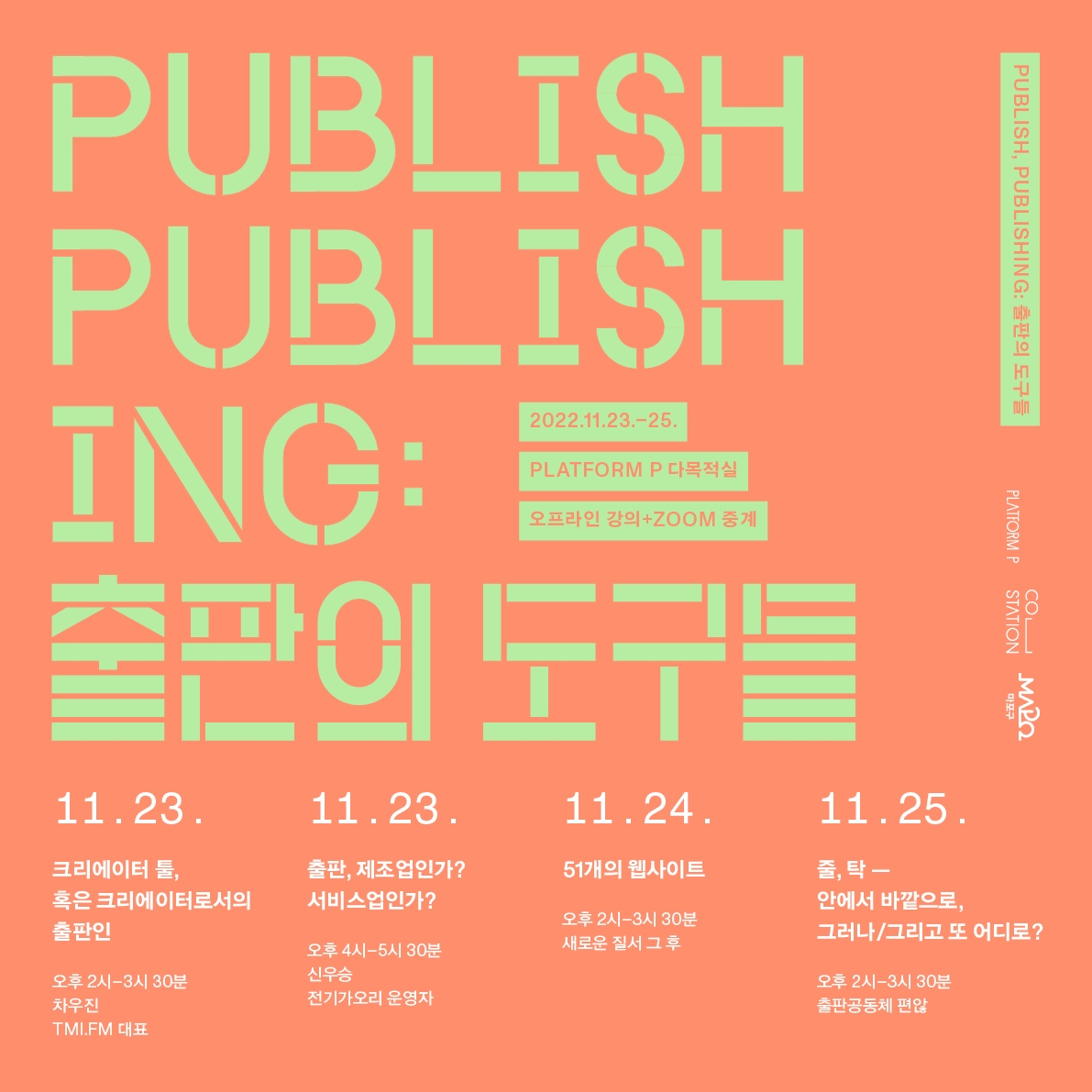 11월 교육프로그램 시리즈의 주제는 ‘출판 플랫폼’ 입니다. ‘출판하다’라는 말의 뜻을 살펴보면, 이는 글이나 그림, 사진 등 어떤 작업물을 ‘세상에 내놓다’는데 방점이 찍힙니다. 덕분에 ‘출판물’ 역시 종이에 인쇄돼 제본된 형태로만 국한되지 않습니다. 메일함으로 도달하거나, 웹사이트를 통해 한시적으로 발행되고, SNS의 피드를 지면으로 삼기도 합니다. 또는 공동체나 모임의 활동 역시 출판에 속할 수 있습니다. 이번 교육프로그램에서는 우리가 일반적으로 ‘출판물’이라 부르는 것들의 범위에서 가장 가장자리에 있거나 또는 그 경계에 놓인 것들을 살펴보고자 합니다.