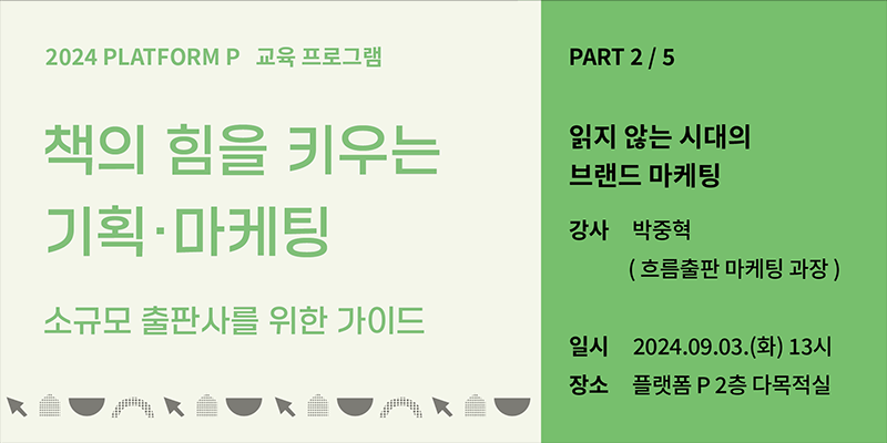 2024년 PLATFORM P의 첫 교육 프로그램으로, [책의 힘을 키우는 기획·마케팅 - 소규모 출판사를 위한 가이드] 연속 강의를 선보입니다. 총 5강으로 구성되었으며, 소규모 출판사들이 출판 기획과 마케팅의 기본기를 효과적으로 습득할 수 있도록 돕는 것을 목표로 합니다. 이 강의를 통해 출판사의 역량을 강화하고, 경쟁력 있는 콘텐츠를 기획하는 데 필요한 실질적인 지식과 전략을 알아가는 시간을 갖습니다.