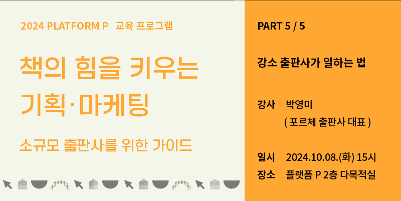 2024년 PLATFORM P의 첫 교육 프로그램으로, [책의 힘을 키우는 기획·마케팅 - 소규모 출판사를 위한 가이드] 연속 강의를 선보입니다. 총 5강으로 구성되었으며, 소규모 출판사들이 출판 기획과 마케팅의 기본기를 효과적으로 습득할 수 있도록 돕는 것을 목표로 합니다. 이 강의를 통해 출판사의 역량을 강화하고, 경쟁력 있는 콘텐츠를 기획하는 데 필요한 실질적인 지식과 전략을 알아가는 시간을 갖습니다.