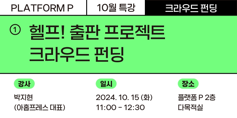 2024년 10월 특강 프로그램에서는 소규모 출판사를 위한 성공적인 크라우드 펀딩에 대해 다룹니다.