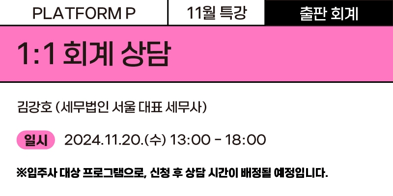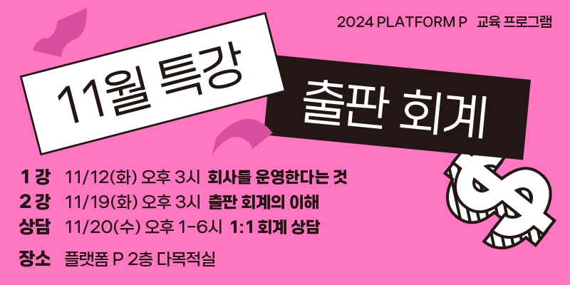 출판사를 처음 운영하면서 겪는 어려움은 책을 만들고 독자와 만나는 것에 그치지 않습니다. 이 특강은 출판사 운영에 필요한 기초 회계 단계를 학습하고, 발생하는 다양한 비용의 종류에 대한 이해를 돕습니다.