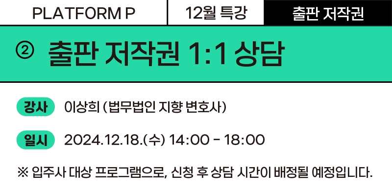 출판 계약과 저작권 거래에 어려움이 있는 입주사를 위한 1:1 상담이 진행됩니다.