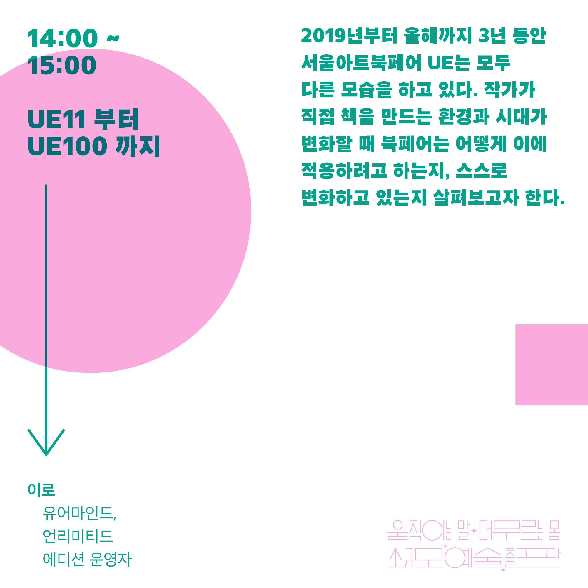 PLATFORM P(마포출판문화진흥센터)는 개관 1주년을 맞아 소규모 예술 출판을 집중적으로 조망하는 온라인 심포지엄을 개최합니다. 6월 29일에서 7월 2일까지 총 4일간 10여 세션에 걸쳐 지금 가장 왕성하게 활동하고 계시는 예술 출판 생태계의 작업자들을 모셔서 각자의 작업 이야기와 고민, 지식과 노하우를 함께 나눌 예정입니다.