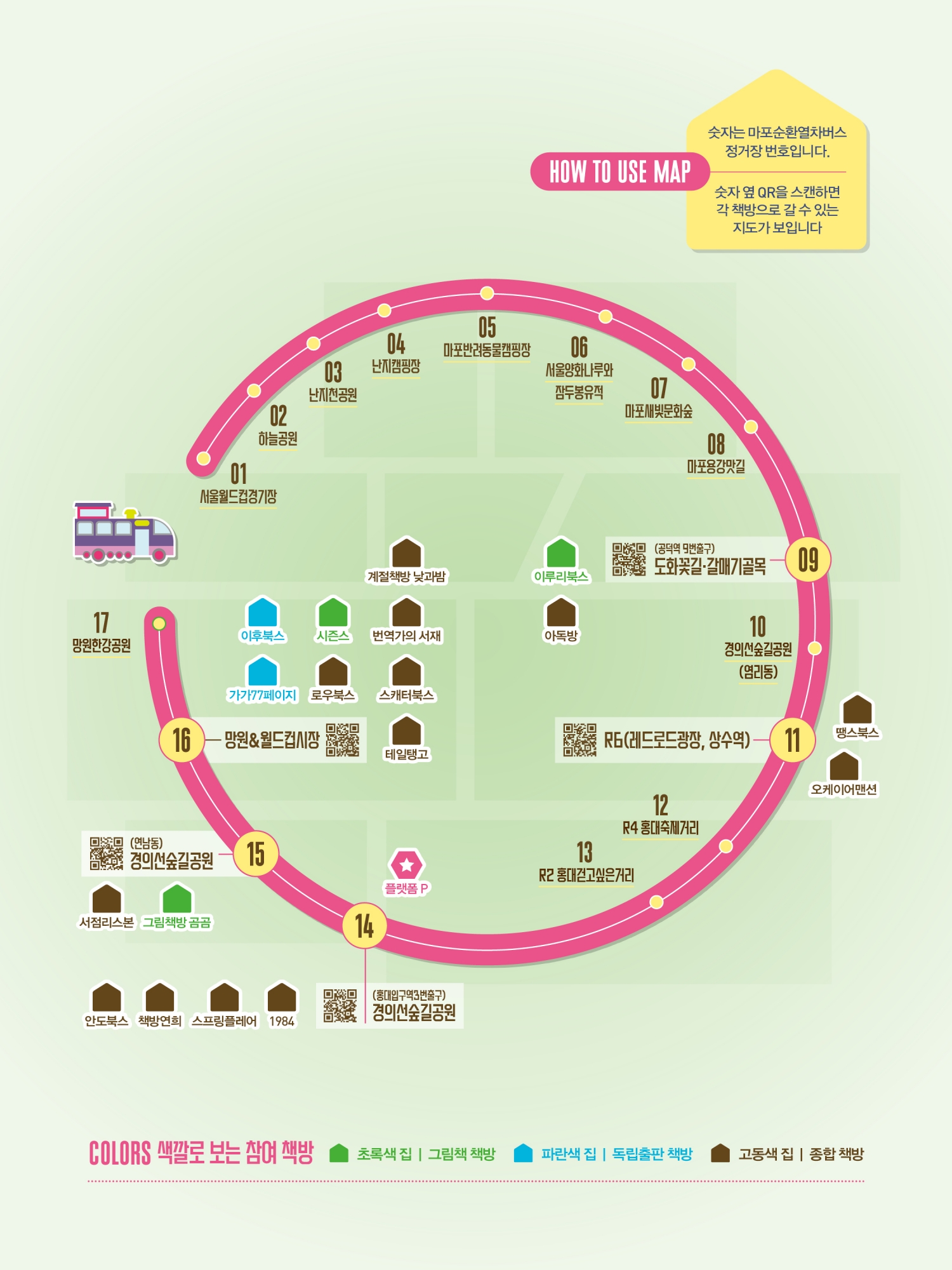 마포순환열차버스 정류장 5곳에 내려 평균 도보 10분이면 도착하는 책방들