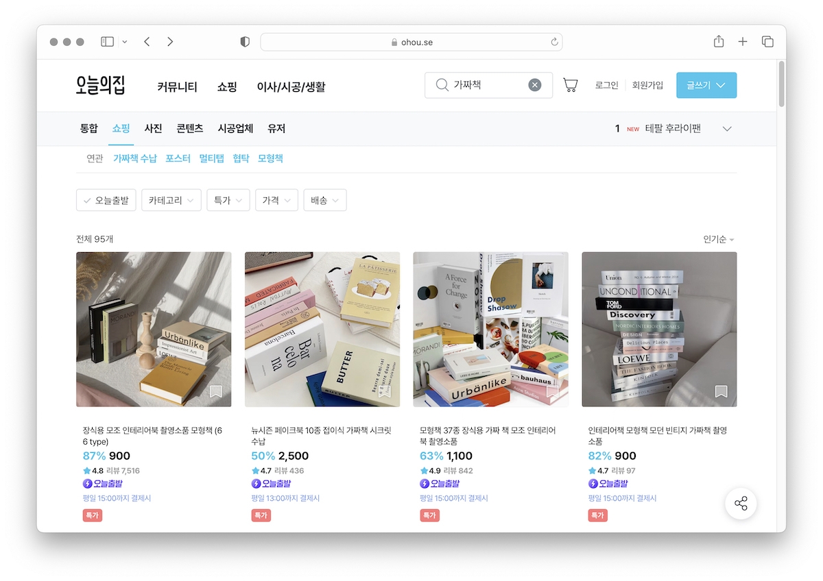 또 다른 가짜책 판매 업체의 카피. ‘허전했던 공간에 감성을 더해주는 감성 인테리어 소품 모형 가짜책 10종’. 이처럼 ‘허전함을 발견’하고 그것을 채울 이미지로서 감성을 제시하는 것은 오늘의 집(뿐 아니라 衣·食) 산업의 역할이다. 요즘 사람들은 카페도 그냥 가는 게 아니라 감성을 구매하고 충전하기 위해 간다(그래서 메뉴판의 ‘미숫가루’에 가짜 영어라도 동원해서 ‘M.S.G.R.’라고 쓰고 싶은 충동이 드는 거다).